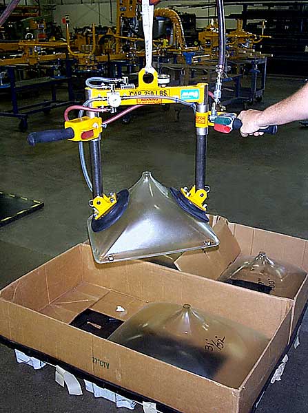 VM和VB系列真空吸吊機(jī)是高度集成的單人操作真空搬運(yùn)輔助系統(tǒng), 適用于透氣、半透氣和不透氣物體。 依靠真空吸盤來吸附物體, 通過電動(dòng)或氣動(dòng)葫蘆來提升物體。 系統(tǒng)操作簡(jiǎn)單, 安全可靠。VH系列真空吸吊機(jī)具有以下特點(diǎn): 故障率低, 維護(hù)簡(jiǎn)單 集成設(shè)計(jì), 最大提升高度2.8米, 最大提升重量500公斤 操作簡(jiǎn)單, 通過控制面板來上升、下降和釋放 持續(xù)吸附, 真空泵持續(xù)工作, 物體可長(zhǎng)時(shí)間被吸附。 頂部空間小, 僅需要73厘米頂部空間 可選用雙速或無極變速電動(dòng)葫蘆 多功能, 根據(jù)不同物體可更換不同吸盤 應(yīng)用廣泛, 不管什么物體, 透氣、半透氣、不透氣物體都可應(yīng)用