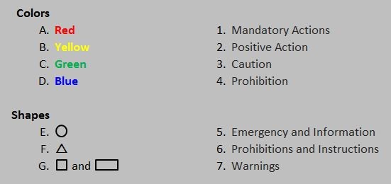 Answer key: A-4 (Red=Prohibition), B-3 (Yellow=Caution), C-2 (Green=Positive Action), D-1 (Blue=Mandatory Actions), E-6 (Circle=Prohibitions and Instructions), F-7 (Triangle=Warnings), G-5 (Square/Rectangle=Emergency Information)
